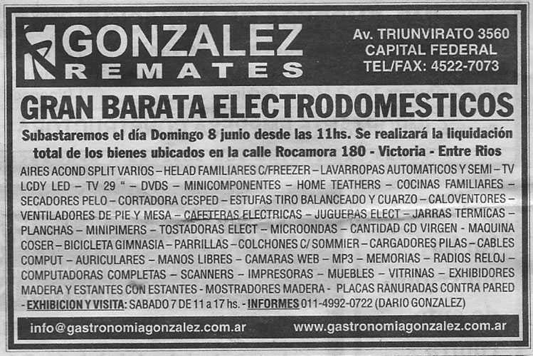 remates pasados GRAN BARATA ELECTRODOMESTICOS Publicado en junio 8, 2014abril 1, 2017 por Remates Gonzalez 08 Jun Remataremos el día domingo 8 de junio de 2014 a las 11 hs se realizará la liquidación total de los bienes ubicados en la calle Rocamora 180 – Victoria – Entre Rios. Remates Gonzalez PRODUCTORA TELEVISIVA 2° ETAPA LA FAROLA DE VICENTE LOPEZ