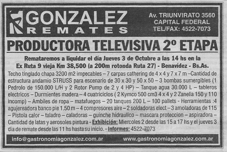 remates pasados PRODUCTORA TELEVISIVA 2° ETAPA Publicado en octubre 3, 2013abril 1, 2017 por Remates Gonzalez 03 Oct Remataremos A LIQUIDAR el día 3 de Octubre de 2013 a las 14 horas en Ex Ruta 9 KM 38,5 (a 200 metros intersección Ruta 27) – Benavidez – Pcia Buenos Aires. Remates Gonzalez PRODUCTORA TELEVISIVA GRAN BARATA ELECTRODOMESTICOS