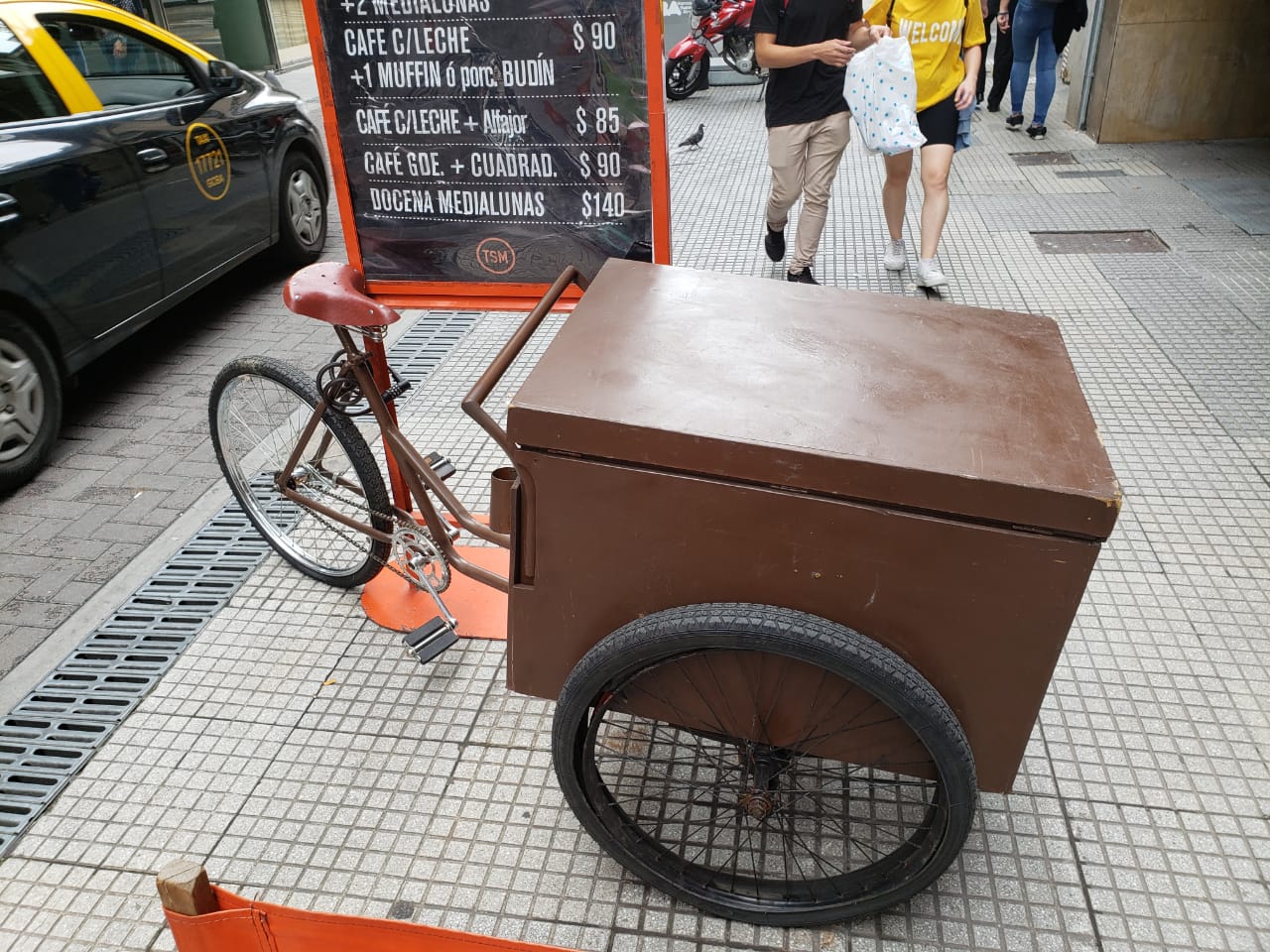SUCURSAL RECONQUISTA 620 CABA A LAS 16 HS : 3 EXCELENTES HELAD TAKE AWAY 1.20 M · 1 MANTENEDOR CALIENTE TAKE AWAY 1.20 ACERO · HELADERA MOSTRADOR ACERO 2 M · HELAD ALMACEN 2 PTAS IG · Hermosa barra madera lustrada · Aire acond Split 18000 fc · 12 mesas tapa pie central pesada · 20 sillas modernas hierro · 5 banquetas altas hierro – Paninera elect Speedy · freezer 300 Lts · Mesada bacha prof 2 m · Mesada acero 2 m lisa · Estante contra pared acero · Termotanque elect 60 L · Bicicleta reparto 3 ruedas · sillas y mesas exterior